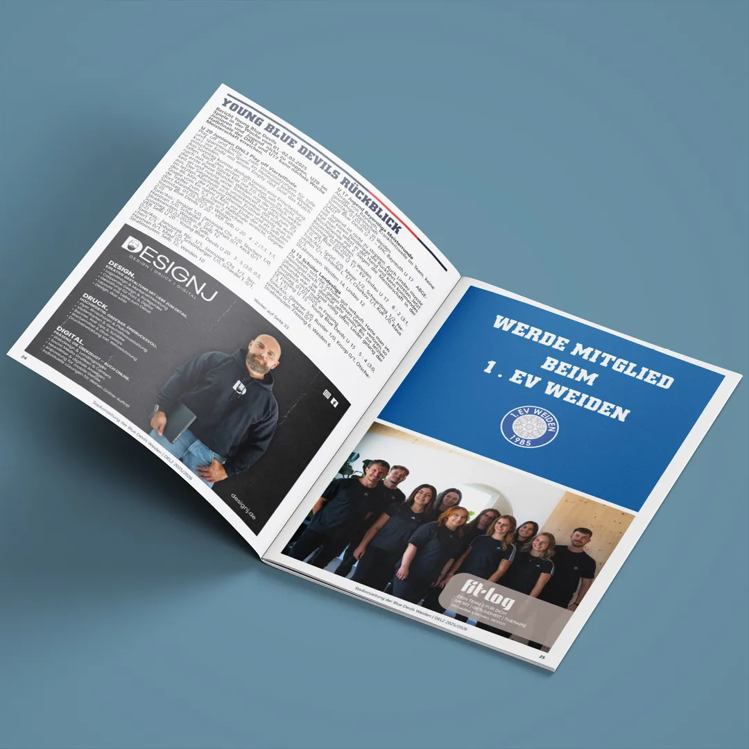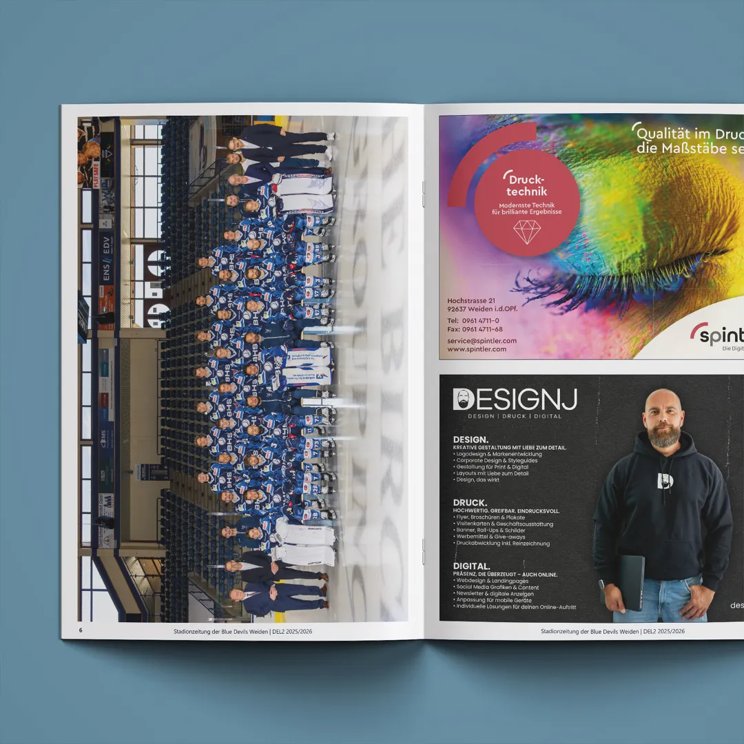 Für die Blue Devils, einen Eishockey-Verein aus der DEL 2, gestalte ich die Layoutvorlagen für das Spieltagsheft „Body Check“, die Saisonkarten sowie die Autogrammkarten für Kader und Staff. Dabei achte ich auf ein einheitliches, professionelles Erscheinungsbild, das die Marke des Vereins stärkt und die Fans anspricht.